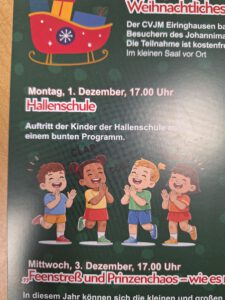 Auch dieses Jahr tritt unsere Hallenschule wieder mit einem bunten Programm am Montag, der 01. Dezember um 17 Uhr auf.